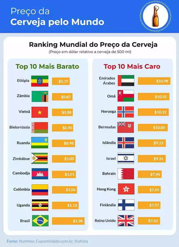 Na América Latina, só a Colômbia tem cerveja mais barata que a nossa, U$ 1,06. E a cerveja mais barata do mundo é a da Etiópia, U$ 0,75 o meio litro. Ao lado dos países mais hospitaleiros, os mais hostis ao turista, os que praticam preços proibitivos do sacrossanto elixir da longa vida.
